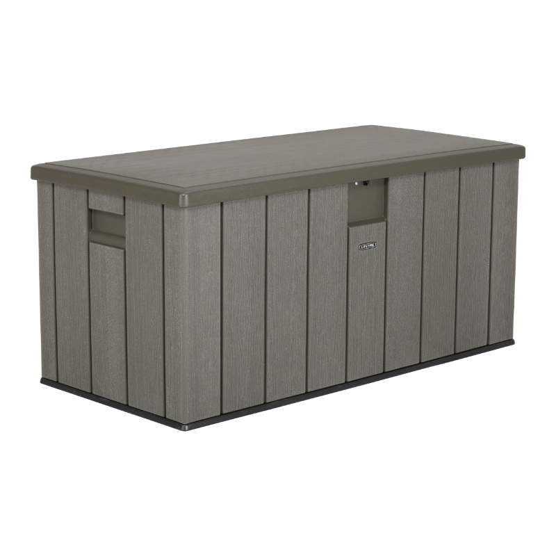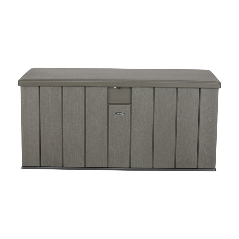 Baúl de exterior de plástico gris con vetas efecto madera, acabado cepillado rugoso.