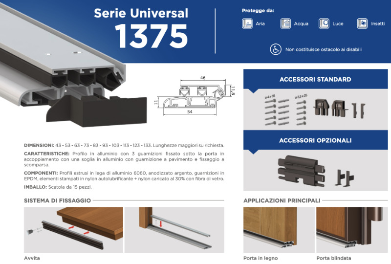 umbral de aluminio anodizado plata 1375 de la Serie Universal de Comaglio está equipado con una junta de suelo y un sistema de fijación oculto.