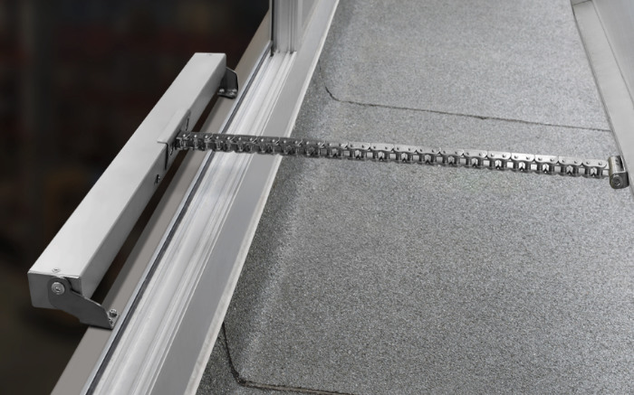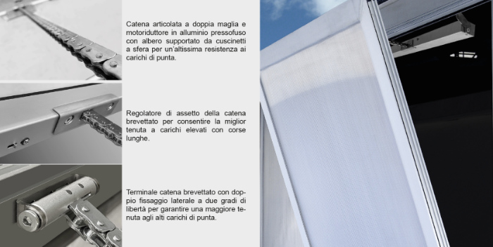 - Cadena articulada de doble eslabón y motorreductor de aluminio fundido a presión con eje soportado por rodamientos de bolas para una muy alta resistencia a los picos de carga;
