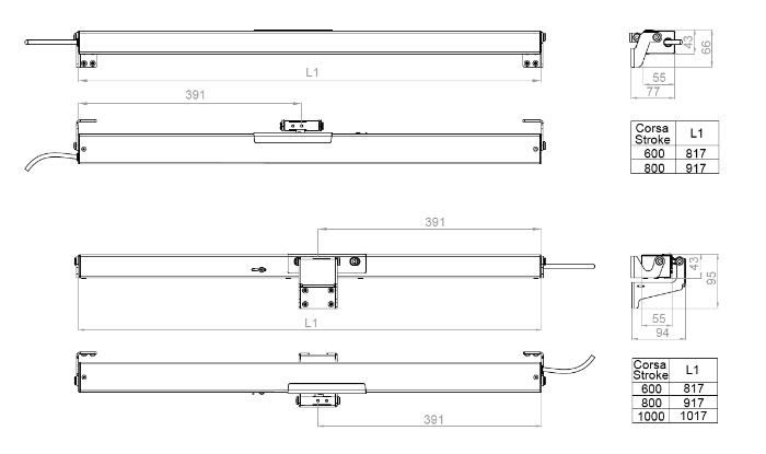 - Carreras 600, 800, 1000 mm (seleccione la variante);