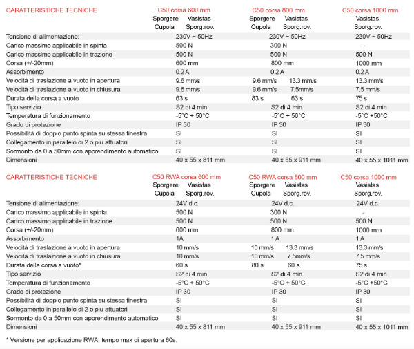 - Dispositivo marcado CE y, en la versión de 24V, verificado según las directivas EN12101-2 para sistemas de evacuación de humos y calor (carrera 600 mm y carrera 800 mm).