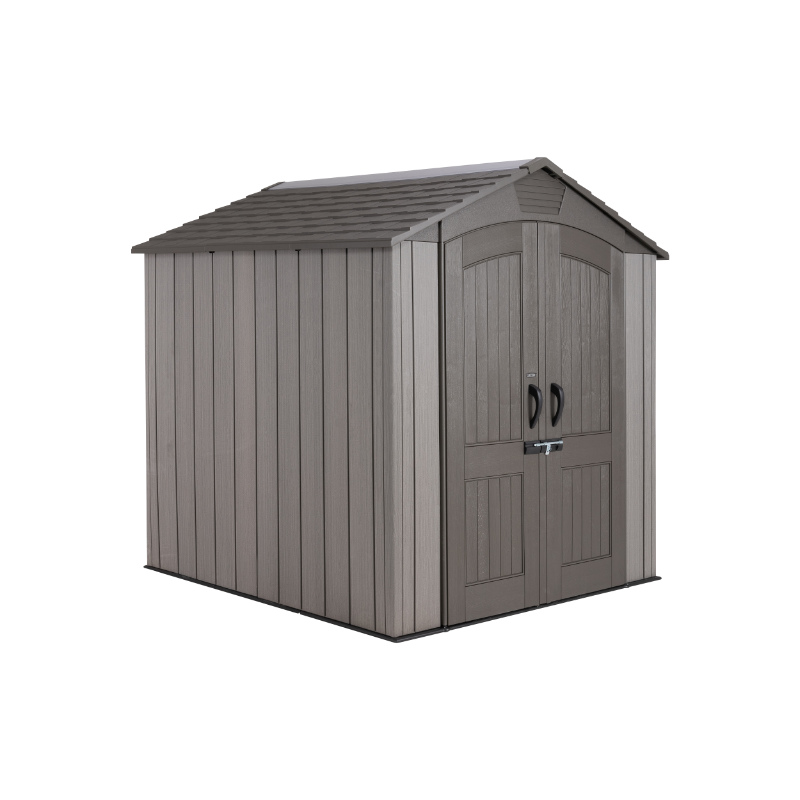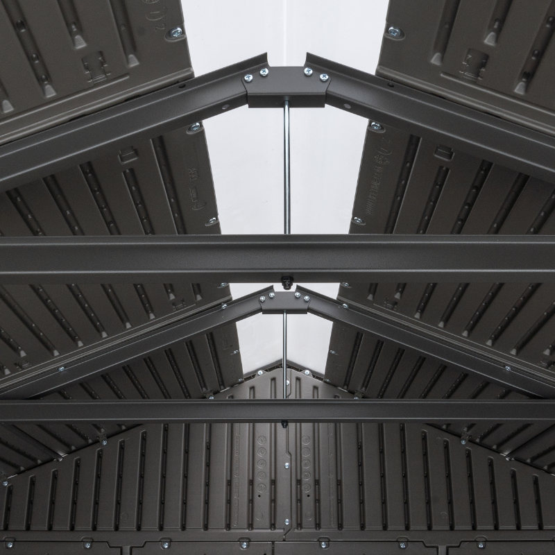 Este cobertizo está hecho de polietileno de alta densidad (HDPE) de doble pared. El color de la casa es gris con vetas efecto madera, acabado cepillado rugoso. El techo está hecho con cerchas de acero y cuenta con una claraboya de cuerpo entero. La puerta está reforzada con componentes de acero, cierre con pestillo.