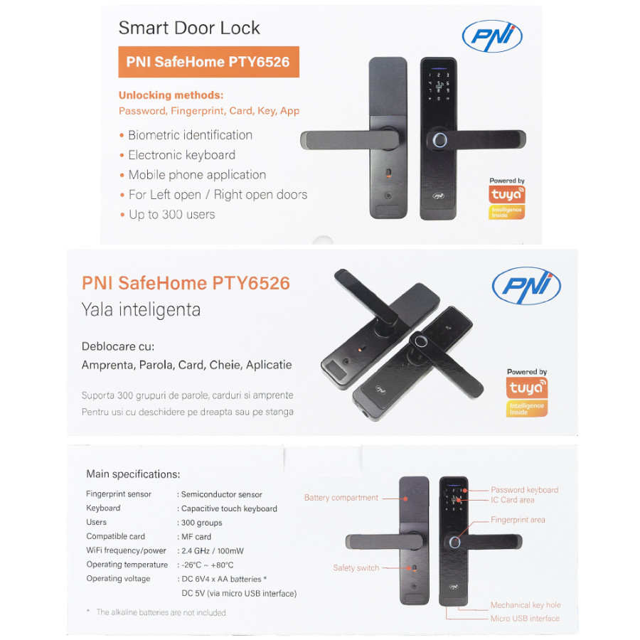 Especificaciones técnicas de la cerradura inteligente PNI SafeHome PTY6526