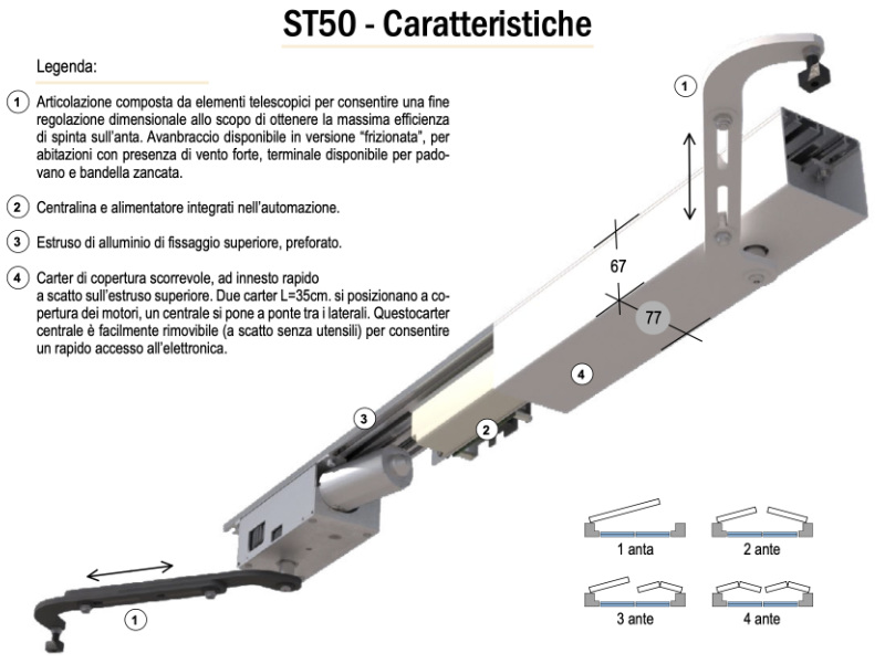 Articulación compuesta por elementos telescópicos que permiten un fino ajuste dimensional para obtener la máxima eficacia de empuje sobre la hoja. Antebrazo disponible en versión “friccionada”, para viviendas con fuertes vientos, terminal disponible para paduan y zancata strip;