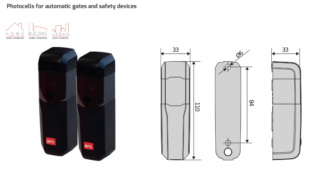 Su amplia compatibilidad con fuentes de alimentación (12-33 V CA y 15-35 V CC) permite utilizar el kit en prácticamente todas las instalaciones de puertas automáticas. Las fotocélulas son compatibles con todas las unidades de control BFT que admiten gestión de seguridad verificada.