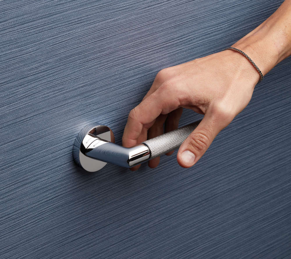 Disponible en varios acabados, desde el refinado oro puro al negro mate técnico, hasta el moderno cromo pulido, Grip se adapta a cualquier entorno, combinando tanto las clásicas puertas pantografiadas como las soluciones más minimalistas y contemporáneas.