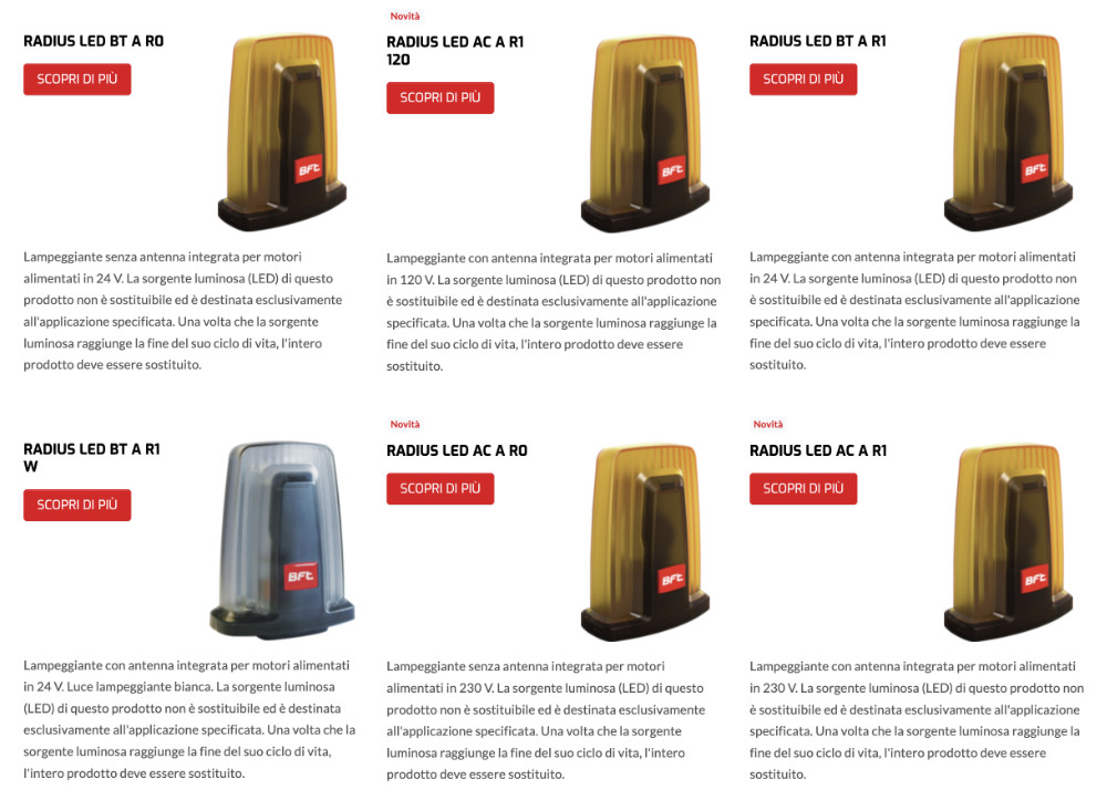 La luz intermitente LED BFT RADIUS es el indicador luminoso oficial para automatismos de puertas y portones, disponible en 6 variantes para adaptarse a cualquier tipo de sistema.