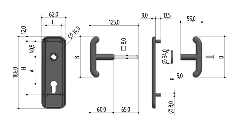 Esta manilla está equipada con una placa perforada Yale y una distancia entre ejes de 70 mm, adecuada para diferentes tipos de puertas basculantes.