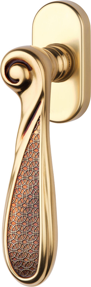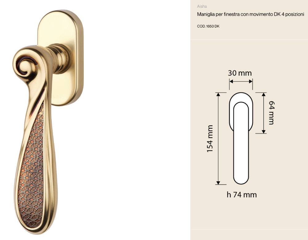 Manilla para ventana Aisha Linea Calì DK 4 posiciones inspirada en la geometría morisca de la Alhambra, con un cuello que se abre como una flor y un gran pétalo que forma el tirador, rico en relieves tridimensionales.