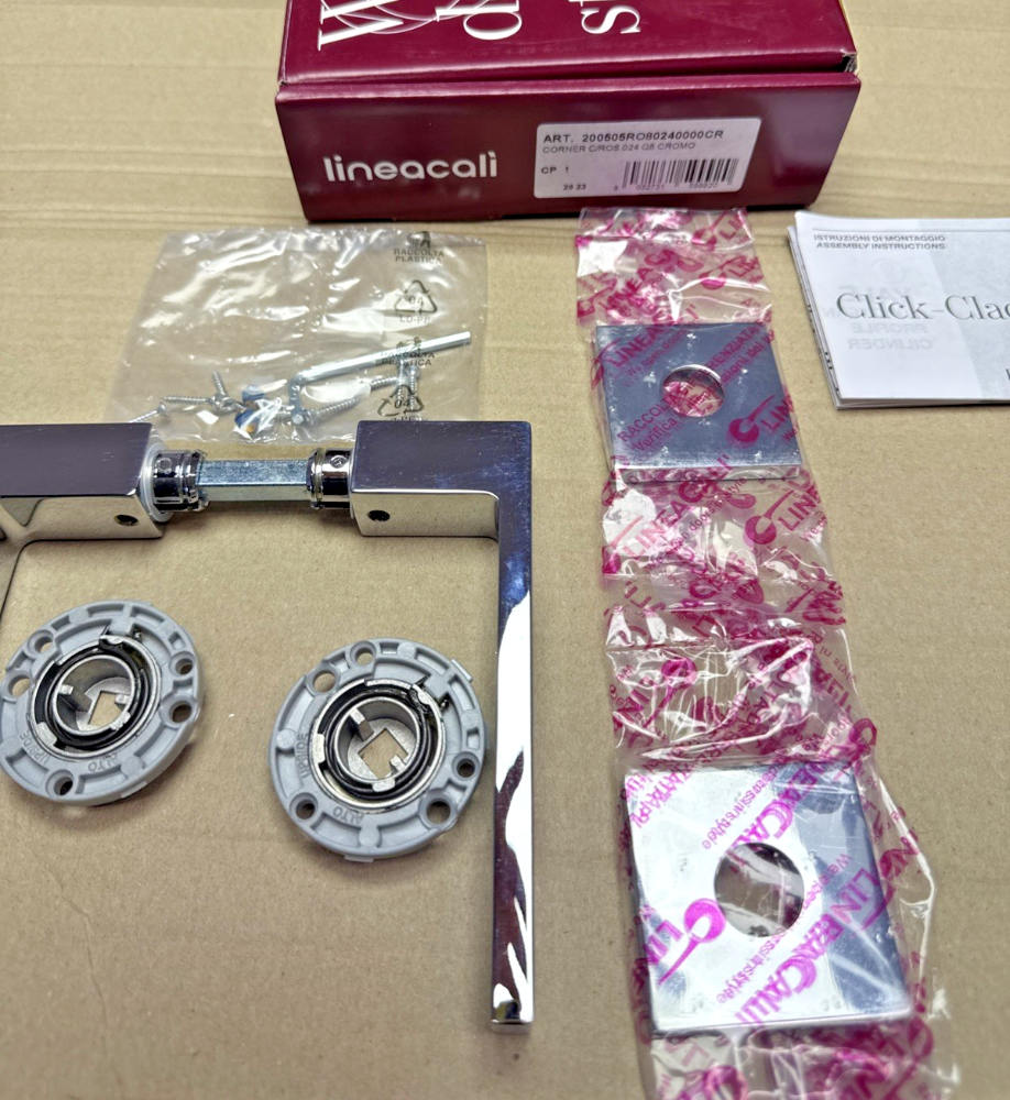Corner Zincral Basic de Linea Calì es una manilla de puerta sobre roseta de diseño moderno y minimalista, con acabado en cromo pulido que dona elegancia y luminosidad al ambiente.