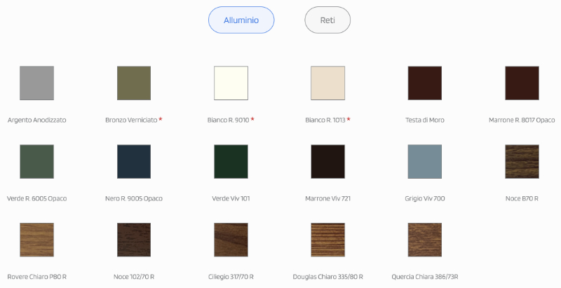 Gama de colores: el fabricante de mosquiteras Officine Rami ofrece una amplia gama de colores de telas (selecciona la variante que desees). Los colores representados en estas tablas tienen un valor puramente indicativo y en ningún caso pueden considerarse colores de referencia por posibles diferencias de color respecto a los reales.