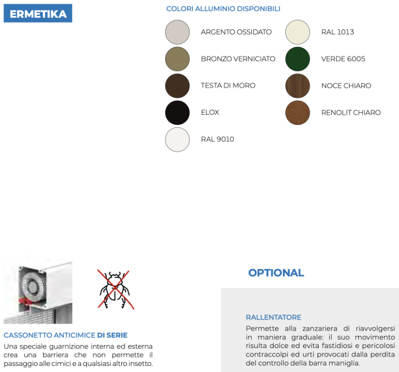 ERMETIKA es una mosquitera antiinsectos con resorte y cajón de 50 mm con movimiento vertical, perfecta para puertas y ventanas.