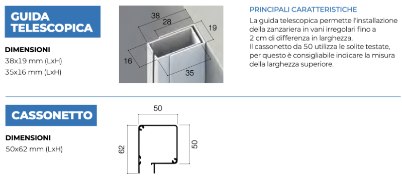 La guía telescópica permite la instalación de la mosquitera en espacios irregulares de hasta 2 cm de diferencia de ancho. La caja de 50 utiliza los cabezales habituales, por este motivo es recomendable indicar la medida del ancho superior.