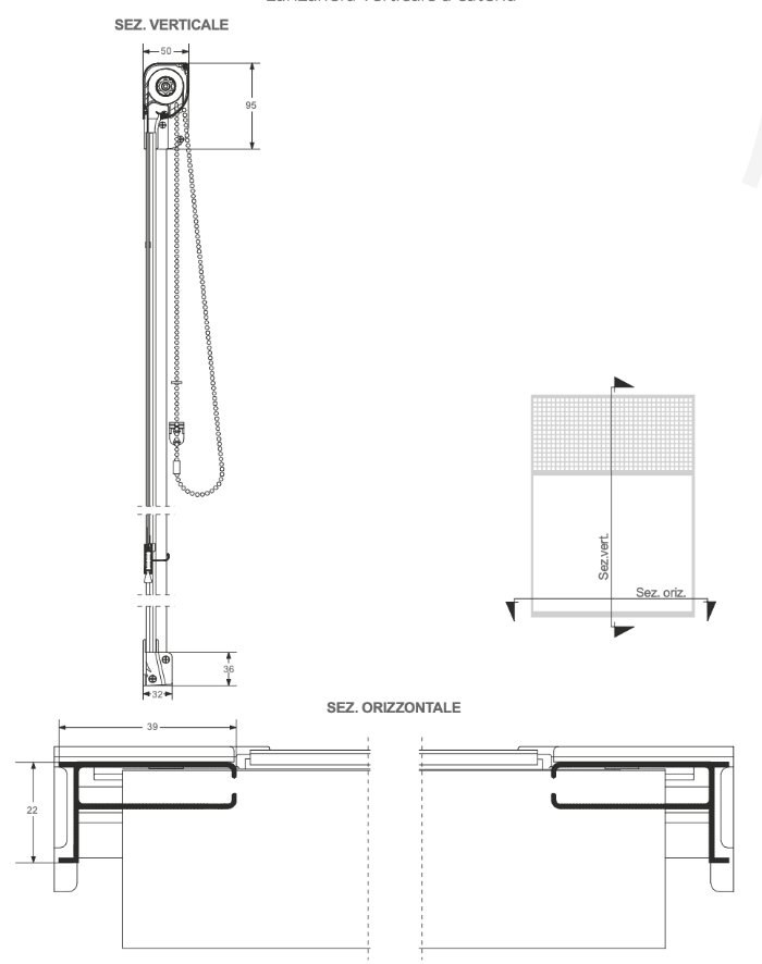- Mosquitera de resorte vertical con red de botones accionada por cadena;