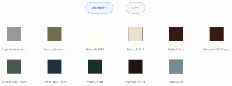 Gama de colores: el fabricante de mosquiteras Officine Rami ofrece una amplia gama de colores de telas (selecciona la variante que desees). Los colores representados en estas tablas tienen un valor puramente indicativo y en ningún caso pueden considerarse colores de referencia por posibles diferencias de color respecto a los reales.