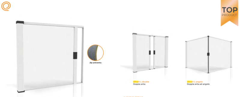 Oltre L Effezeta es una mosquitera cortavientos lateral con cremallera, ideal para cubrir dimensiones extra y también disponible en la versión de esquina. Además, es posible elegir entre diferentes variantes, como Oltre L Double, la mosquitera de doble puerta, y Oltre L corner, la mosquitera de esquina.