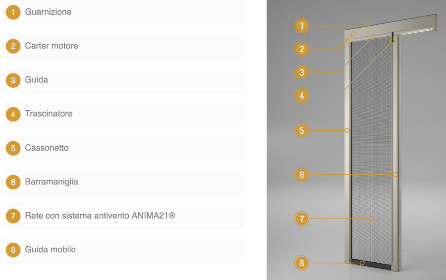 Integra el innovador sistema cortavientos ANIMA21 Bettio, que permite que la red se retraiga automáticamente en caso de viento fuerte o impactos. Los perfiles y plásticos están diseñados para mosquiteras antichinches, capaces de crear una barrera eficaz contra las chinches.