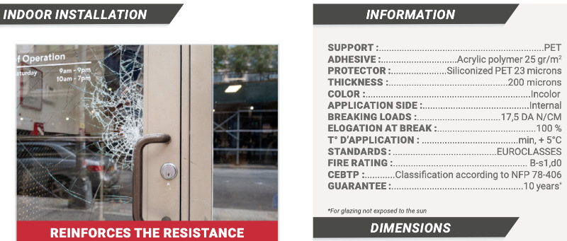 Respetando las más rigurosas normas de seguridad, estas películas (clasificadas según la Euronorma de reacción al fuego) no alimentan ni propagan las llamas en caso de incendio, manteniendo sus propiedades protectoras incluso bajo el efecto de un calor intenso, evitando que el vidrio se rompa.