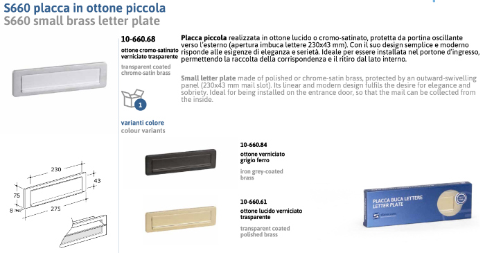 Placa pequeña para buzones fabricada en latón pulido o cromado satinado, protegida por una puerta abatible hacia el exterior (apertura del buzón 230x43 mm). Con su diseño simple y moderno responde a las necesidades de elegancia y seriedad.