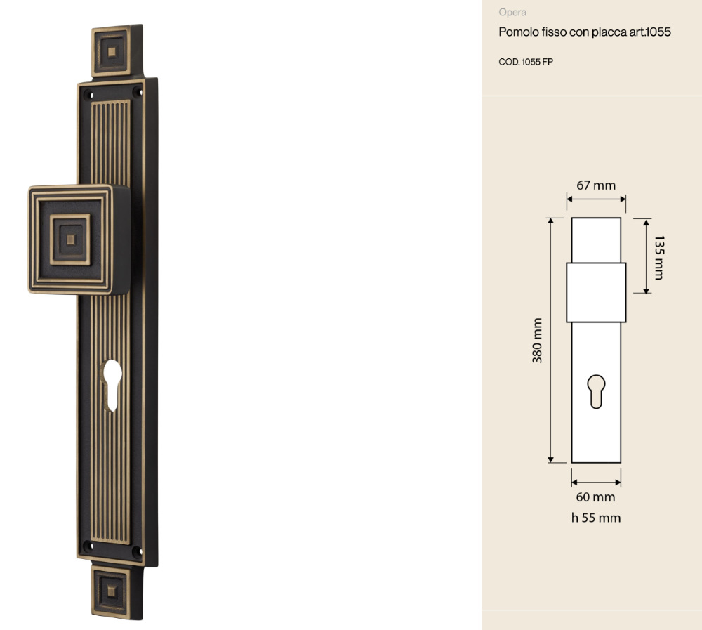 pomo fijo con placa Opera Linea Calì es un mueble que llama la atención al instante: sólido, elegante y con un carácter audaz. Sus formas geométricas perfectamente equilibradas, junto con la placa decorada con líneas verticales, evocan el estilo neoclásico, reinterpretado de forma contemporánea para adaptarse incluso a los interiores más modernos.