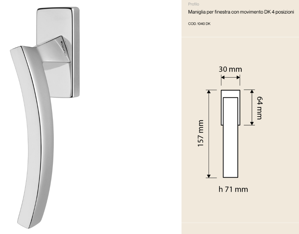 Fabricada en latón de alta calidad, la robusta manilla DK Profilo Linea Calì es agradable al tacto y está diseñada para durar. El mecanismo DK garantiza una apertura y un cierre suaves, ideal para ventanas oscilobatientes .