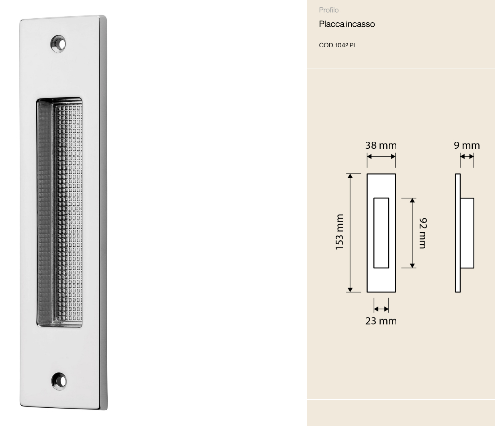 La placa empotrada Profilo Linea Calì está diseñada para puertas correderas modernas que requieren una solución refinada y discreta. Su perfil delgado y su superficie meticulosamente elaborada hacen de este accesorio no solo práctico, sino también un detalle elegante que realza cualquier espacio.