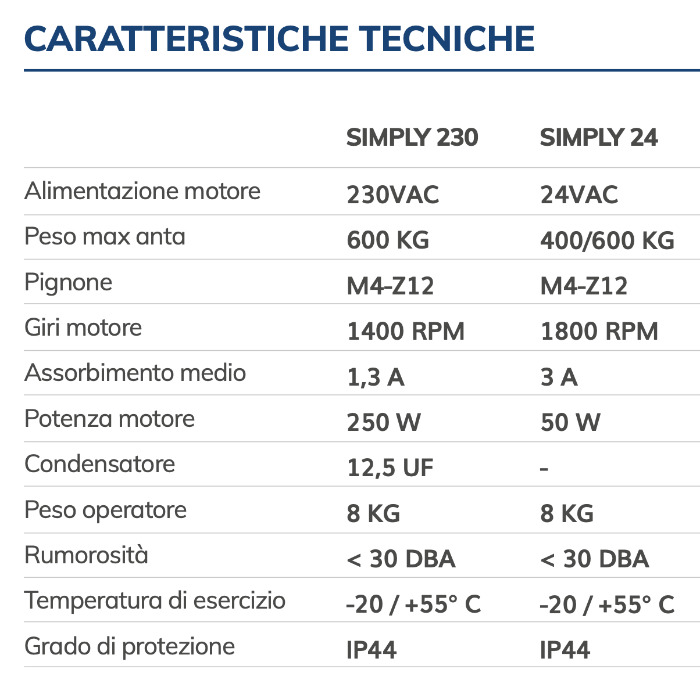 Características técnicas del motor para cancelas SIMPLY VDS