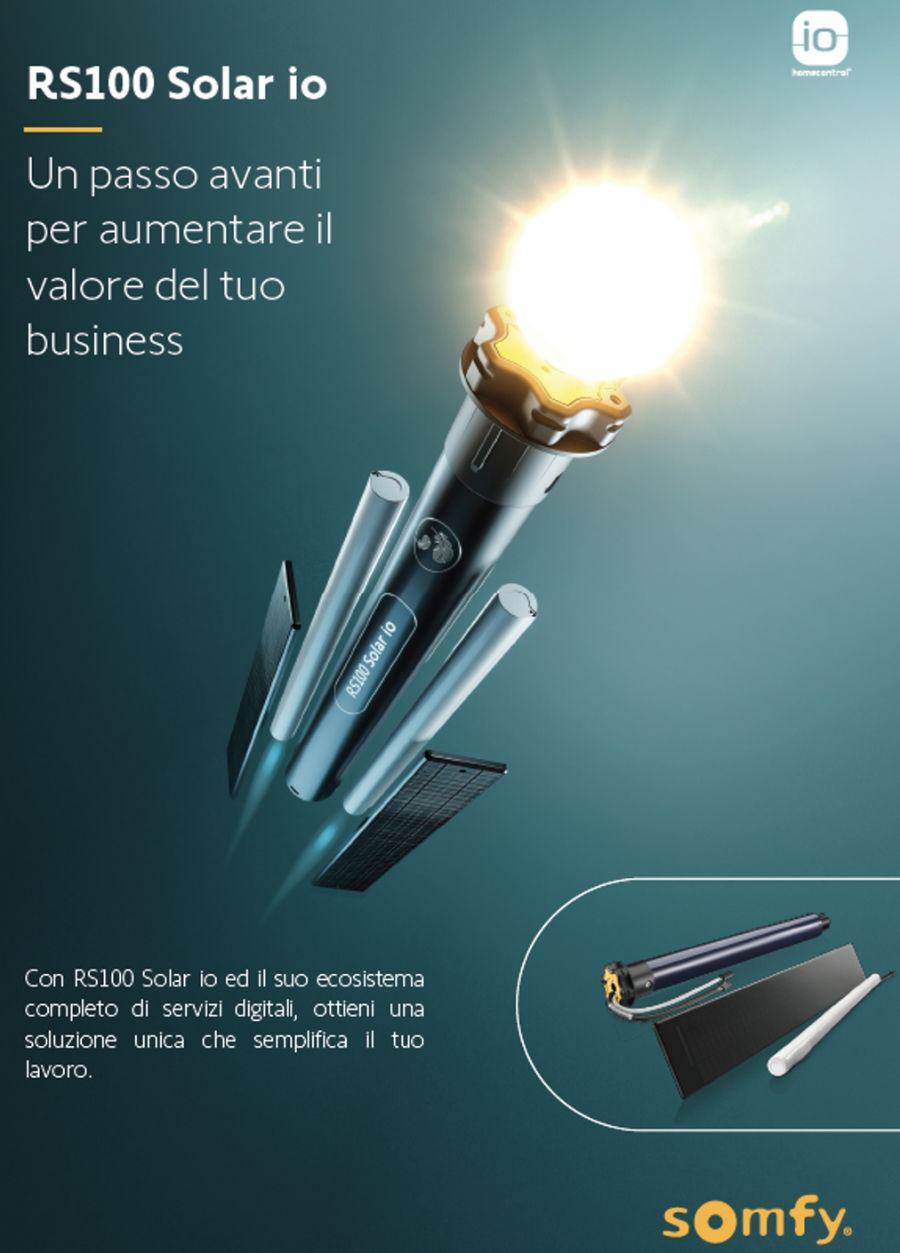 La línea de motores para persianas RS100 io de Somfy se enriquece con la incorporación de una nueva versión alimentada de forma independiente por energía solar.