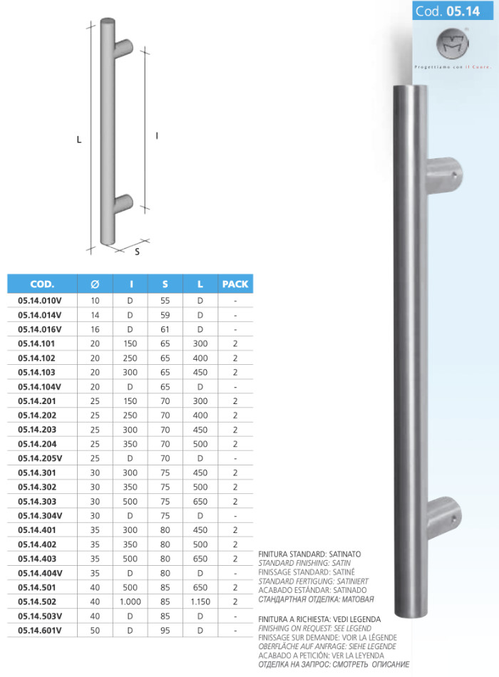 Tirador recto de acero inoxidable satinado, pulido o pintado calidad AISI 316L o AISI 304 (seleccione la variante), marca MPM código 05.14.