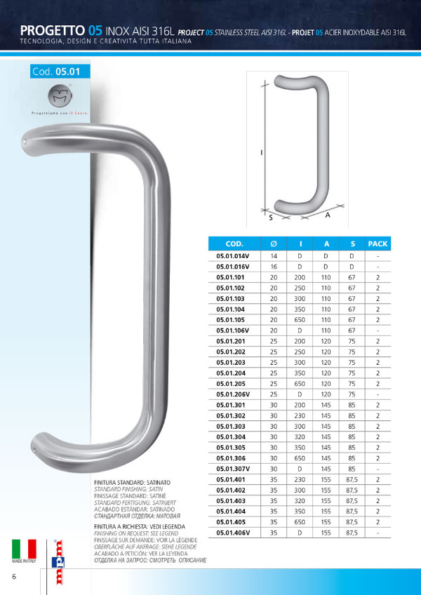 Tirador tubular en acero inoxidable AISI 316L o 304 (seleccione la variante que desee), fabricado en Italia por el fabricante MPM.