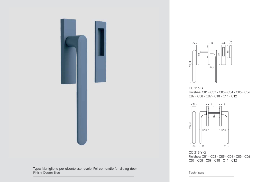 Manilla para puerta corredera Colombo Design CC 113 ONE Q MOOD : versión cuadrada con roseta alargada, altura 289,5 mm. Diseño esencial y contemporáneo.