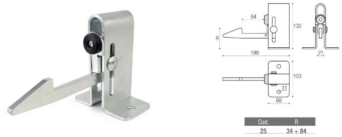 regulable en altura hasta un máximo de 84 mm . Tope de puerta para puertas diseñado para tubulares de 64 mm, equipado con un tope de goma para amortiguar el golpe.